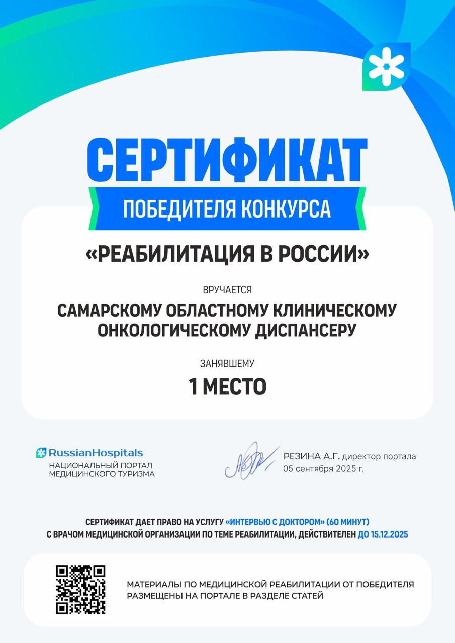 Самарский областной клинический онкологический диспансер занял 1 место в конкурсе «Реабилитация в России», организованном национальным порталом медицинского туризма «Russian Hospitals».