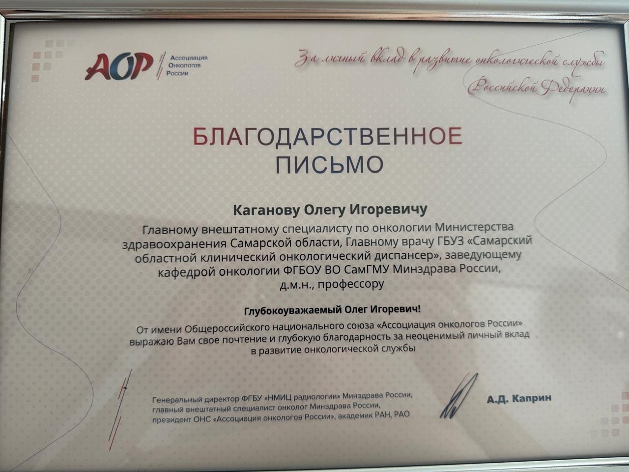 Главный врач диспансера, главный внештатный специалист по онкологии Минздрава Самарской области, заведующий кафедрой онкологии СамГМУ, д.м.н., профессор Олег Каганов был отмечен Благодарственным письмом за личный вклад в развитие онкологической службы Российской Федерации за подписью генерального директора «НМИЦ радиологии» Минздрава России, главного внештатного специалиста онколога Минздрава России, президента Ассоциации онкологов России, академика РАН, РАО Андрея Каприна.