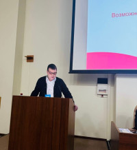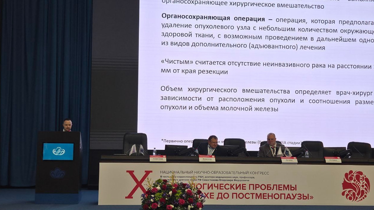 Заведующий отделением онкогинекологии Владимир Щукин и заведующий отделением опухолей молочной железы №1, к.м.н. Максим Ткачев выступили с докладами.