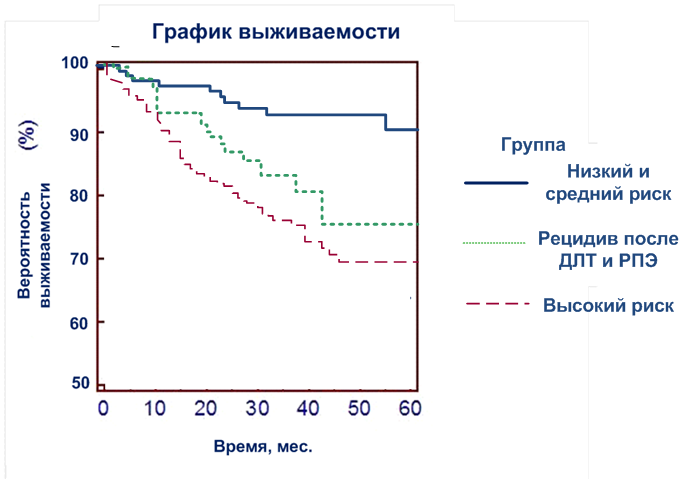 Безрецидивная выживаемость по Каплану-Мейеру у всей группы больных составила 79,2 % при 7- летнем наблюдении (рис.3). Через 7 лет безрецидивная выживаемость составила 93,9 % у пациентов с низким риском, 91,8 % со средним риском, 69,5% с высоким риском и 75,4 % с местным рецидивом после ДЛТ и РПЭ (рис.4).